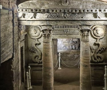 Following breakfast, transfer to Alexandria, a port city on the Mediterranean coast of Egypt. Start your day by visiting the Catacombs of Kom El Shoqafa, a Roman burial ground containing three underground floors. Next, you will tour the Roman theater located in Kom El-Dikka. This structure dates to the 2nd century CE. It features a semicircular design with 13 rows of marble seats, once covered with a wooden roof. To round off the excursion, you will visit the famous-in-ancient-world Bibliotheca ("library") of Alexandria. Enjoy lunch at a local restaurant and then transfer back to Cairo. Dinner on your own. Overnight in Cairo.